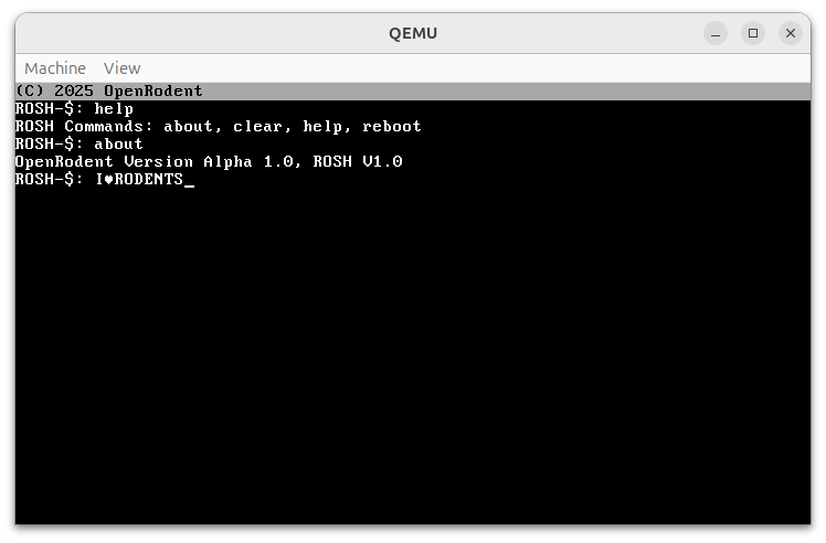 OpenRodent is an open-source 16-bit x86 hobbyist Operating System in development. This Operating system includes 4 commands so far.